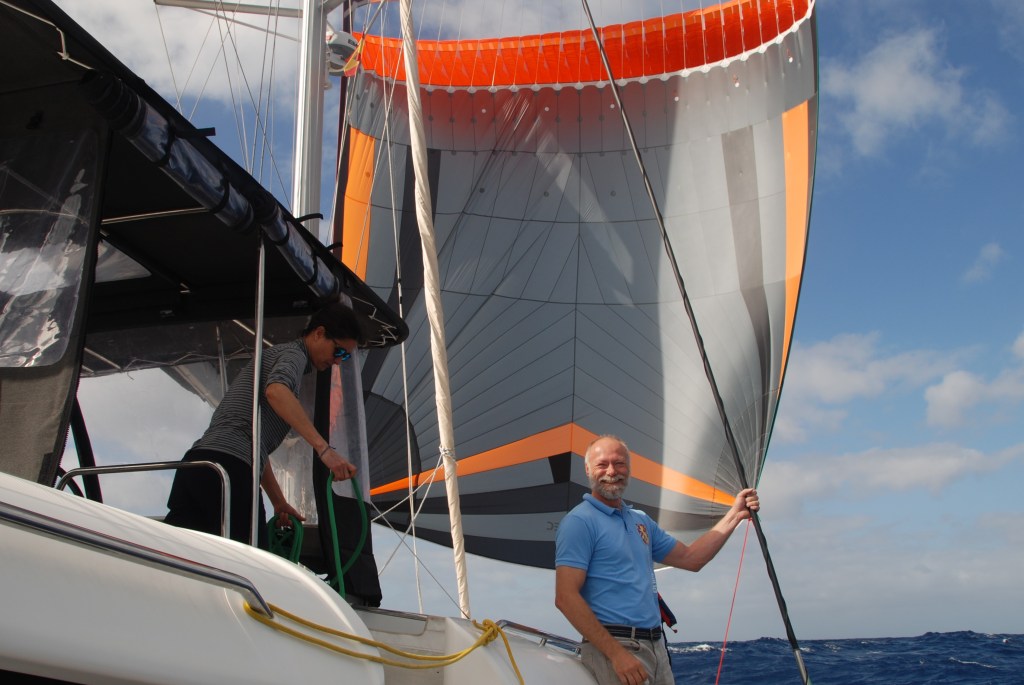 En el día de ayer y hasta que llegamos a Barbados hemos navegado el 95% del tiempo con la vela » Parasail» una clase de «spinnaker» con un agujero en medio y una especie de ala