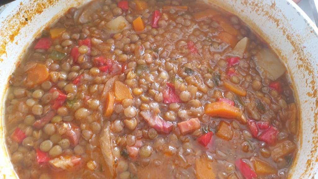al menos una hora, esto dependerá del punto de las lentejas, añadir sal y pimienta al gusto, si os gustan más sueltas añadir más agua.