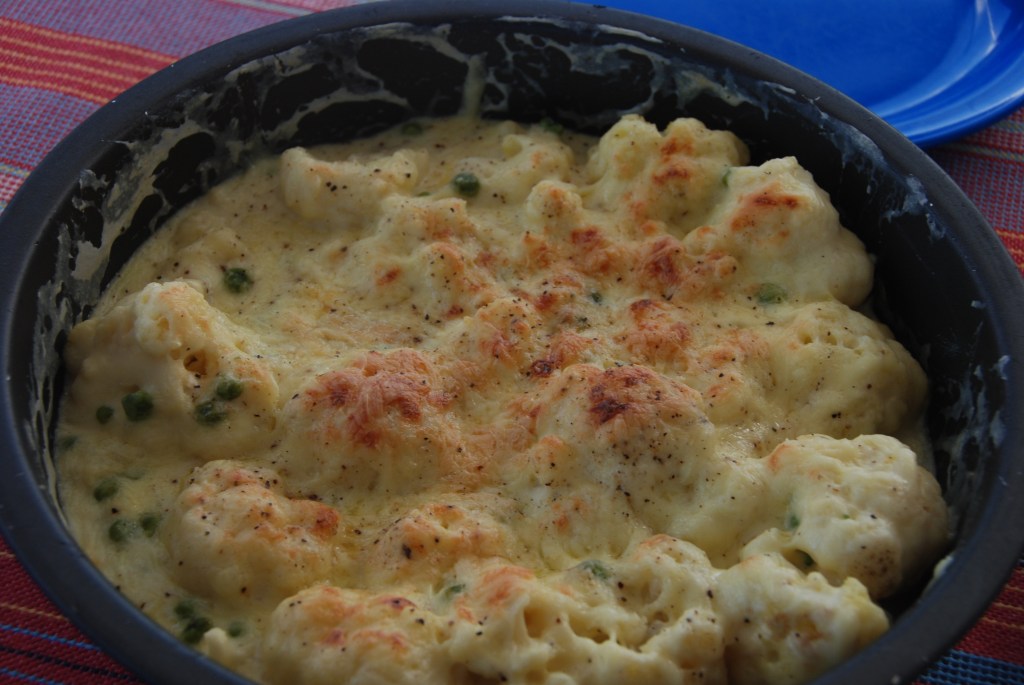 cubrimos la coliflor con la bechamel de queso y terminamos con un poco de queso rallado por encima, horneamos unos minutos hasta que la bechamel y el queso estén dorados.