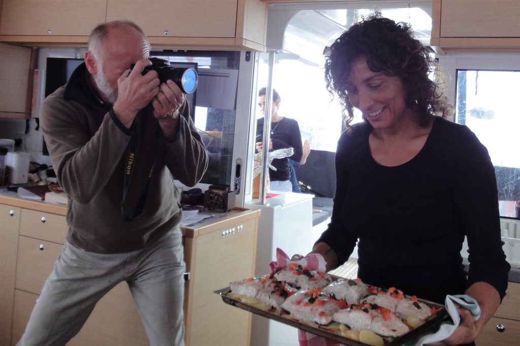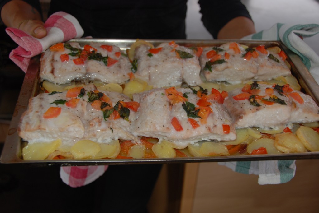 Espolvoreamos un poco de pimienta y al horno, el cual ya habremos precalentado a 200º ( tengo que aclarar que el horno del barco es bastante simple y la temperatura es siempre la misma) , lo dejaremos en el horno, aproximadamente unos 20m, yo le añado un poco de vino blanco cuando ya lleva unos minutos en el horno para que no se seque y porque me gusta.