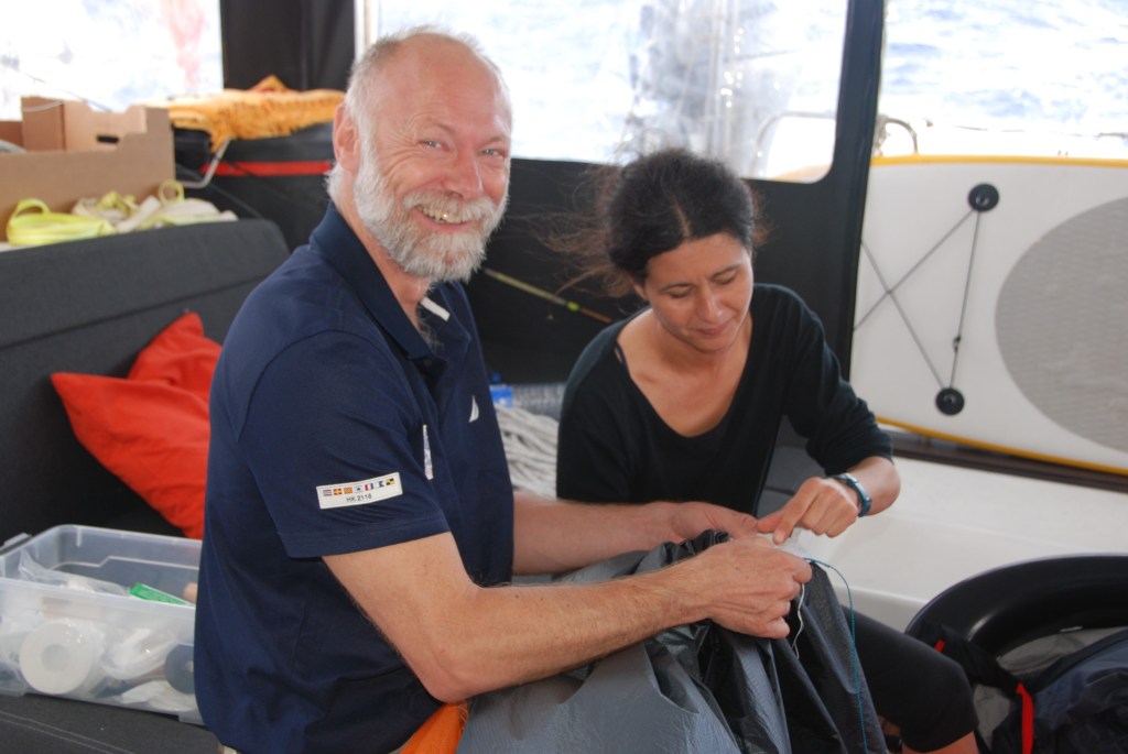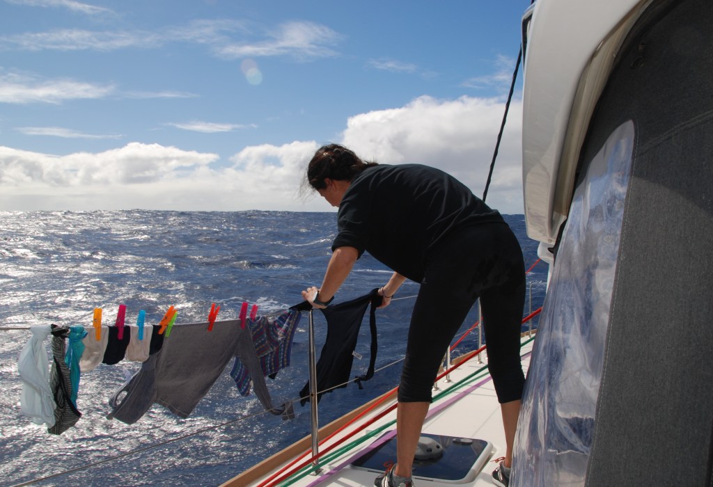 Vamos a empezar por la mañana ,día en que nos dedicaríamos a nuestras rutinas , hoy también usaríamos la lavadora ya que empezaba a ser necesario lavar alguna cosilla que otra, la verdad que todas las tareas se convierten en entretenimiento, tampoco faltarán charlas, risas, relax…. el Atlántico nos está mimando y eso se nota en la buena energía de la tripulación, además de que comemos muy bien….jeje.