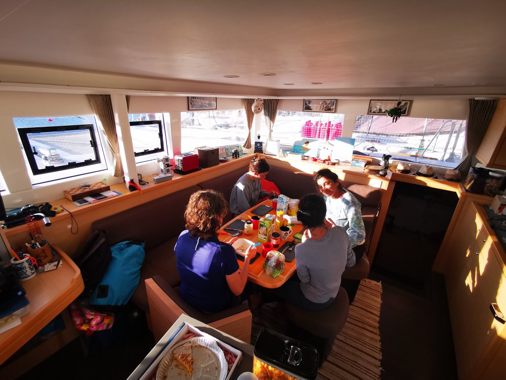 La convivencia es perfecta compartiendo charlas, juegos de mesa , guardias nocturnas, pesca, cocina. El idioma en el que nos comunicamos es el inglés , idioma que no domino a la perfección, pero lo voy llevando, además tengo la suerte de poder hablar en italiano con Roberta y Silvia.