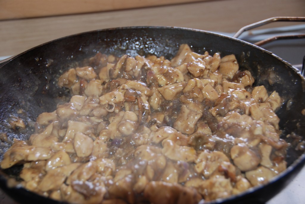 Una vez hecho esto sofreímos la cebolla, cortada muy fina, el jengibre, el comino en polvo, la sal y la pimienta, a continuación añadimos el pollo cortado en dados, cocinamos un par de minutos y añadimos los boletus ya hidratados, dejamos cocinar por unos minutos, removemos y añadimos la harina, si es necesario añadir un poco de agua o vino blanco.