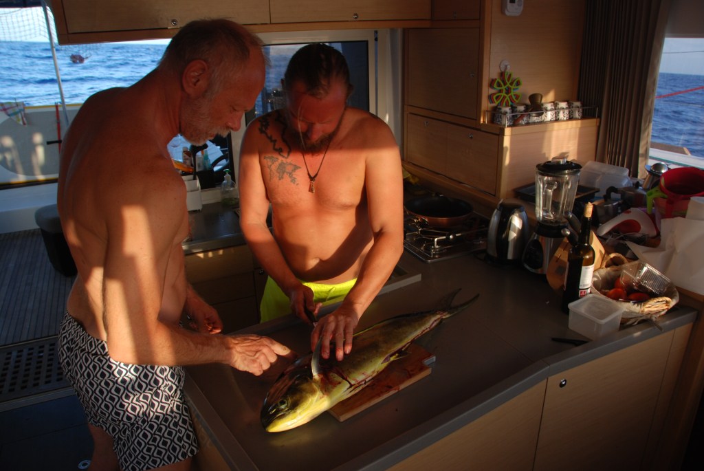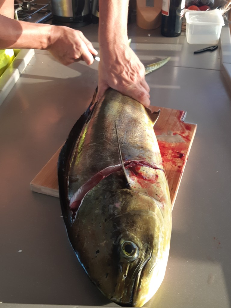 Hoy también pescamos un Mahi Mahi y aprovechamos para que Jono preparase el pescado estilo Nueva Zelanda, además de limpiarlo , que es una máquina. Pero bueno esta receta la dejaríamos para la noche porque pescamos justo antes de comer y ya había sacado el salmón que teníamos en el congelador, un salmón buenísimo que llevaba días esperando por nosotros. Así que preparé una pasta con Salmón , siempre basándome en mi amada y maestra cocina Siciliana.