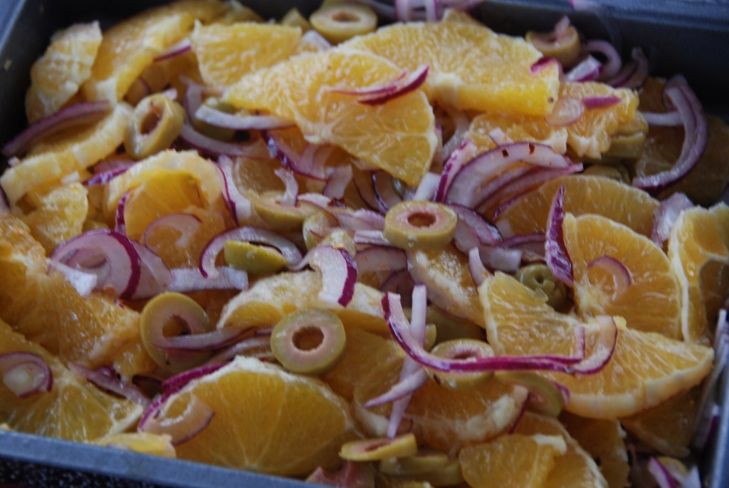Al ser un día especial tuvimos también un menú especial, albóndigas estilo marroquí al mediodía y para la cena ensalada de naranja ( Receta Siciliana) y ceviche de Mahi, Mahi