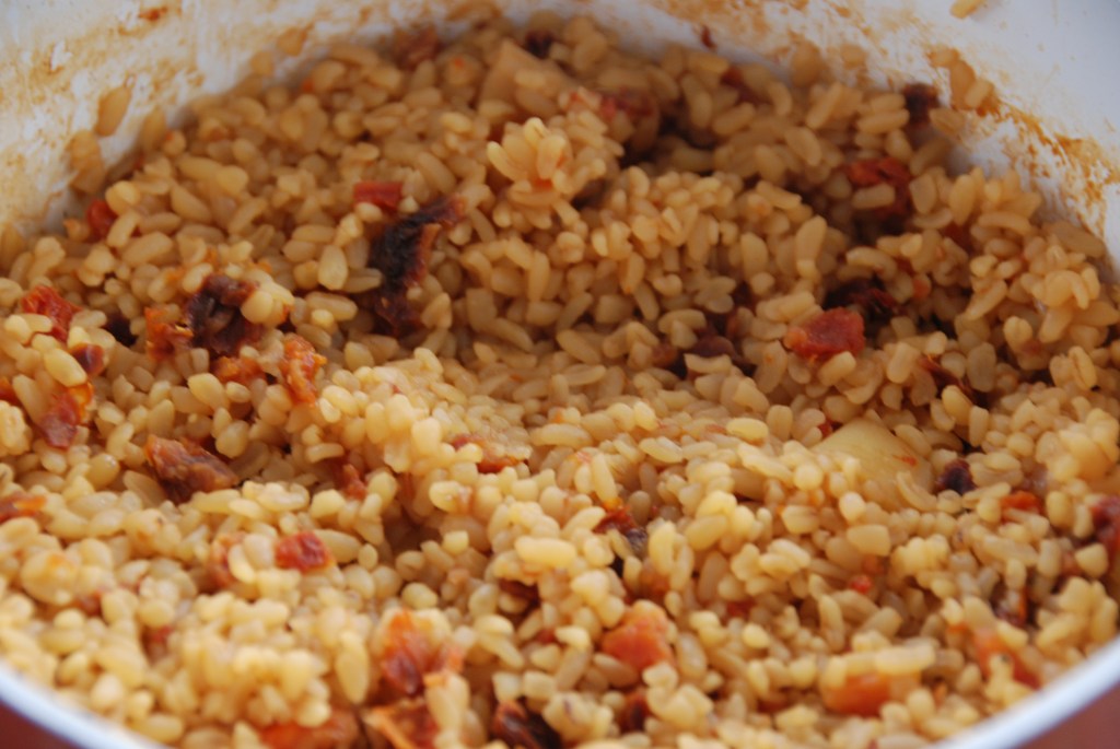 Se cocina igual que el arroz, siendo necesario el doble de volumen de agua que de bulgur, el tiempo de cocción unos 20m en este caso ya que usamos una bolsa de bulgur ya condimentada, que aúnque no soy muy partidaria de esta clase de productos puedo deciros que la habían comprado en Tuquía y era de primerísima calidad con tomates deshidratados y especias varias.