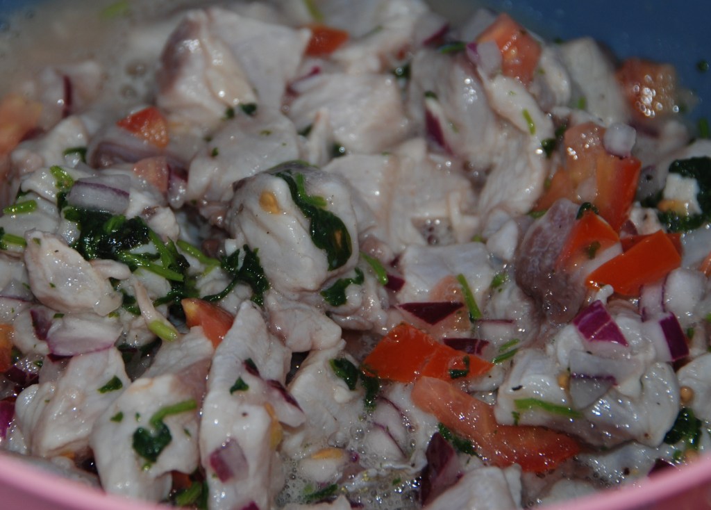 Una vez limpio lo cortamos en tacos pequeños añadimos sal, a continuación lo ponemos en un cuenco con el zumo de los limones hasta que quede cubierto todo el pescado,