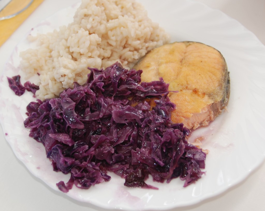 Comida a base de un plato único con: Salmón a la plancha acompañado de risotto a los 3 quesos y col lombarda el vino tinto