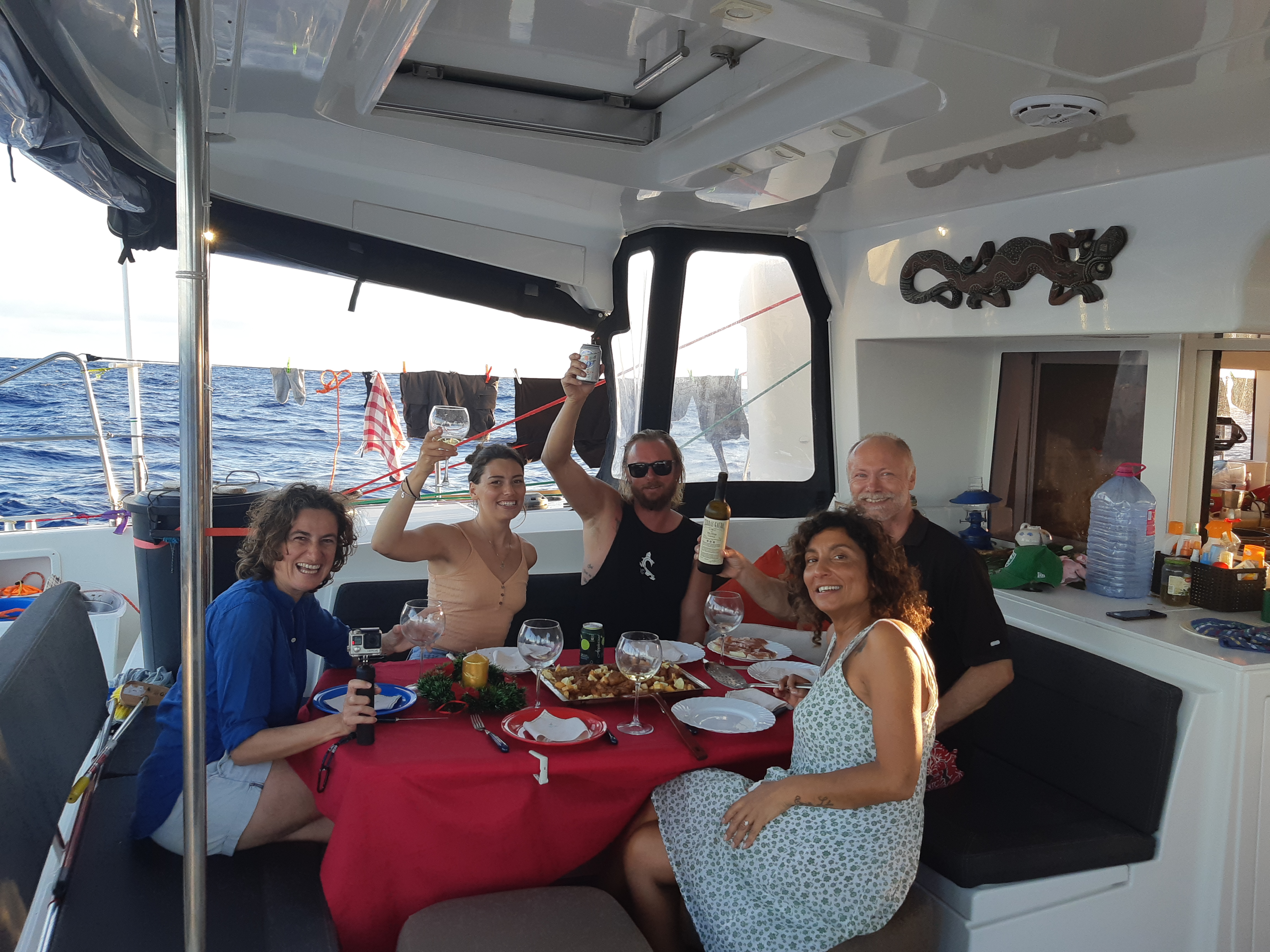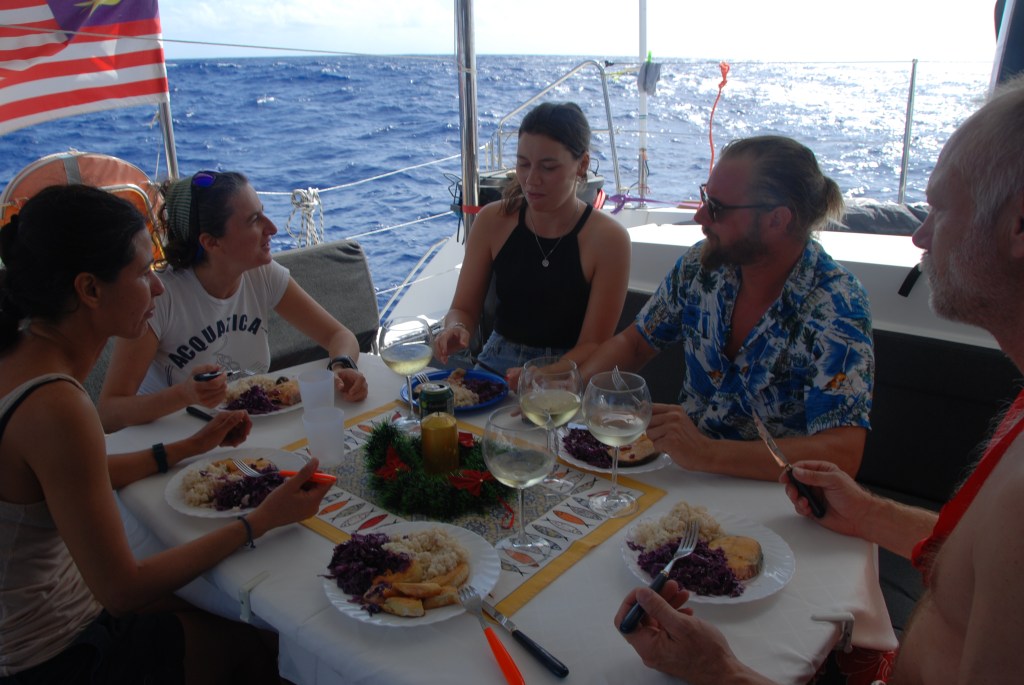 25 de Diciembre, continuamos con las celebraciones y los quehaceres en el barco: guardias nocturnas, navegar, cocinar, limpiar, intentar pescar… pero hoy además