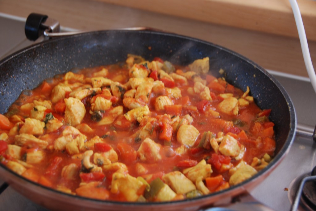 De todas maneras habíamos sacado pollo del congelador por si no pescábamos, teniendo en cuenta además que los 14cm del dichoso pez no iban a llegar para 6 personas . Así que mientras yo intentaba convencer al Atlántico para un último pez , Roberta se encargó de cocinar pollo al curry estilo oriental con fideos de arroz, una receta muy parecida a la que habíamos preparado con anterioridad pero con más especias, jengibre y picante, ya que