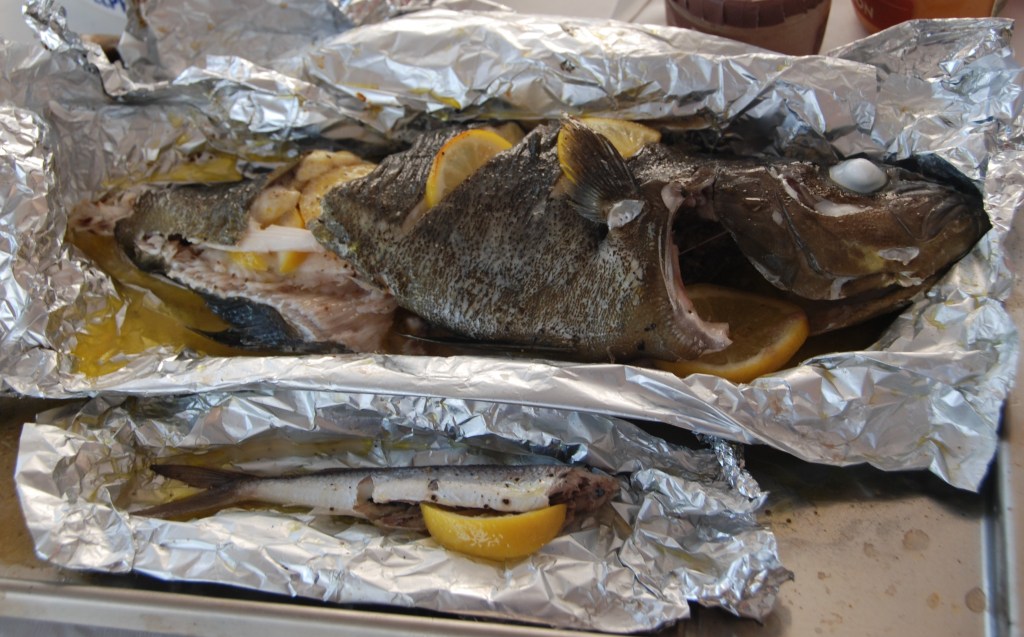 Lo primero es lavar el pescado , en este caso los dejamos enteros pero sin las tripas y escamas , lo introducimos en el papel de aluminio con un poco de sal , le hacemo unos cortes en el lomo, le ponemos unas rodajas de limón, añadimos un chorro de aceite de oliva ( o un poco de mantequilla en el caso de Jono) y un chorrito de vino blanco , cerramos bien y al horno entre 10/20m dependiendo de la temperatura y el pescado .