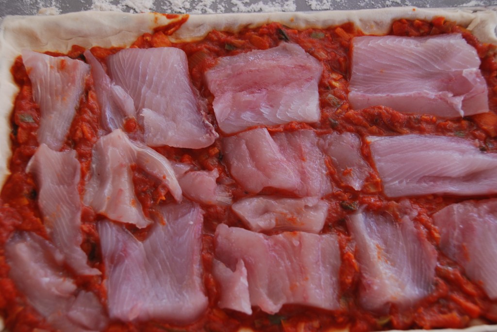 Una vez que la masa está lista, enharinar la superficie dónde la vayamos a estirar, antes de poner la parte bajade la masa en la bandeja untarla con un poco de aceite para que no se pegue, a continuación poner las verduras, encima los lomos de pescado a los que le habremos eliminado el exceso de sal, y cerrar con el resto de la masa.