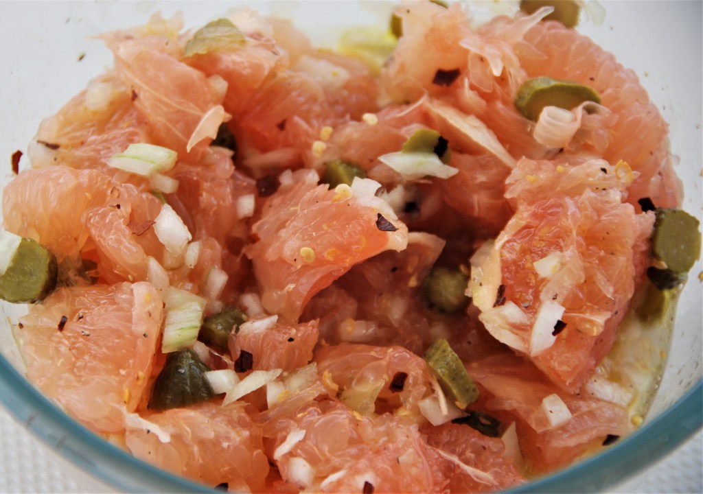 Pelamos los pomelos ,asegurándonos de quitar toda la parte blanca, cortamos, añadimos la cebolla y los pepinillos troceados y aliñamos con la pimienta negra, la sal, la guindilla