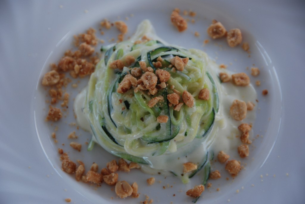 Espaquetis de calabacín con salsa de queso y cacahuetes